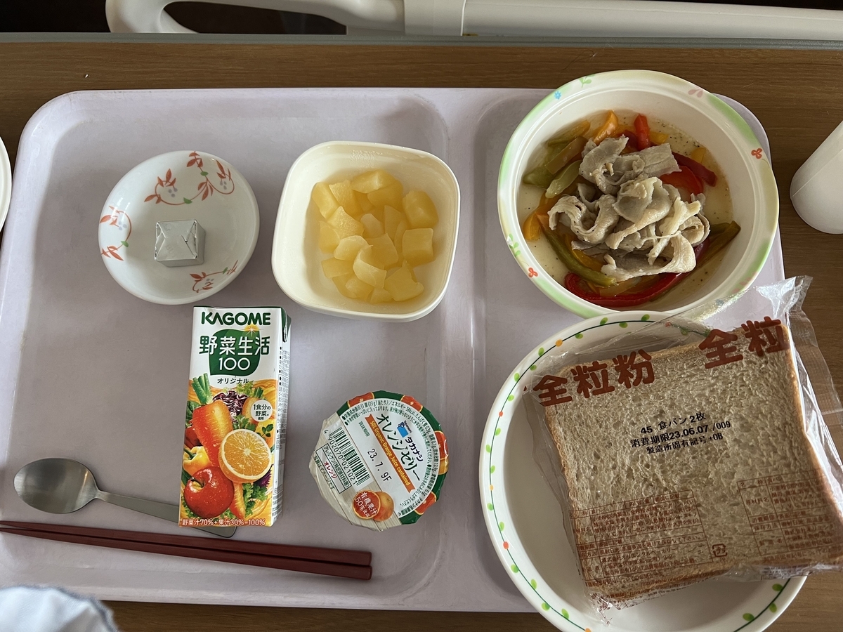 2023-08-09 【病院飯@20日目昼】 リンク メニュー(加熱常食) パン8X2 P)バター 豚ねぎ塩焼き75 付)三色ピーマン Mおひたし(白菜) M果物缶(りんごダイス) 野菜ジュース *食事制限、調整などで画像にない場合がございます。 ※骨髄移植後のため生食禁止 リンク 栄養成分表示 エネルギー たんぱく質 炭水化物 食塩相当量 740kcal 17.9g 86.2g 2.8g リンク